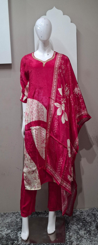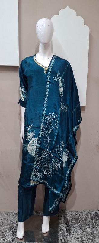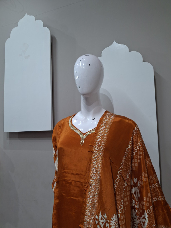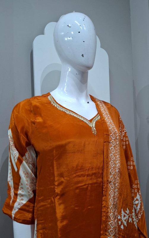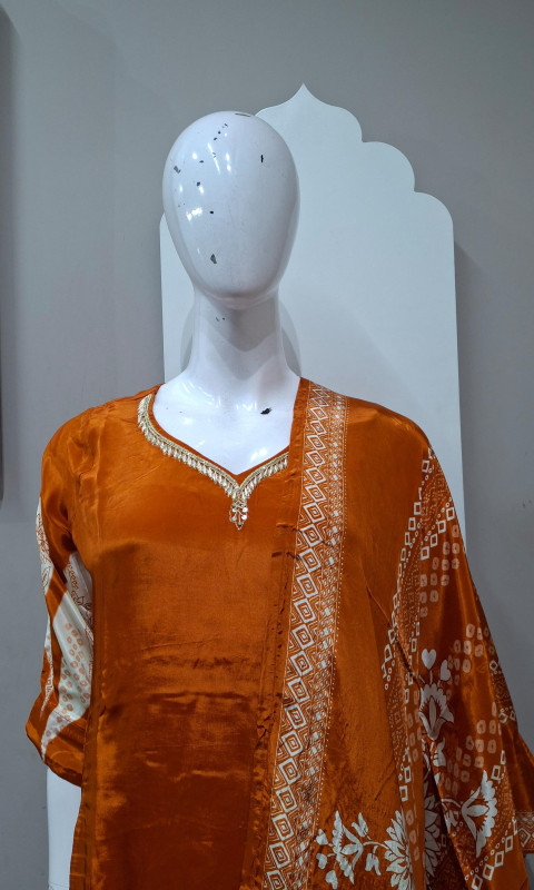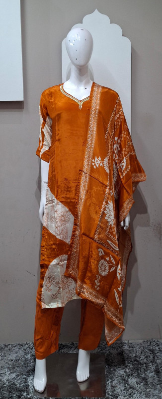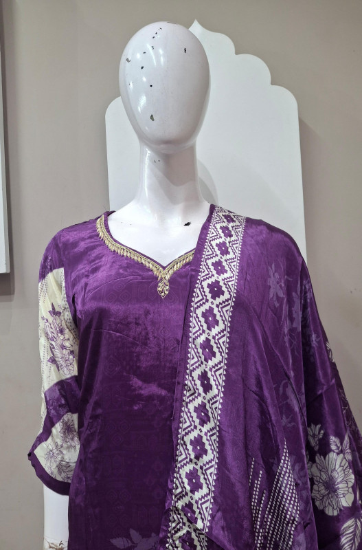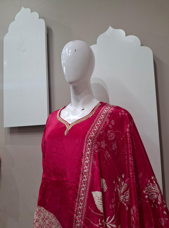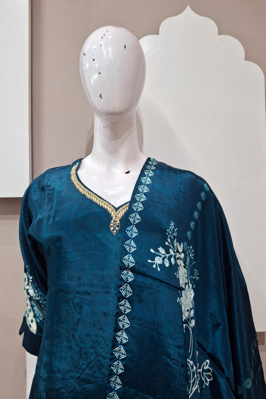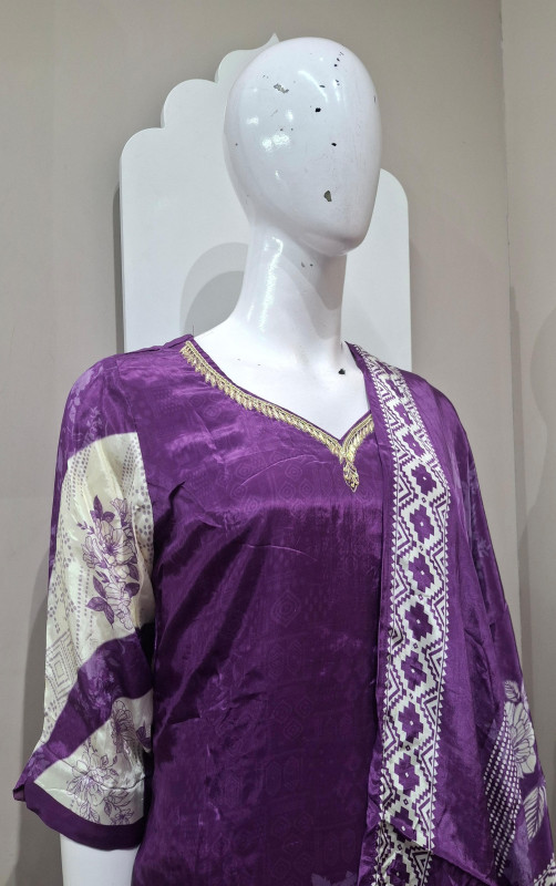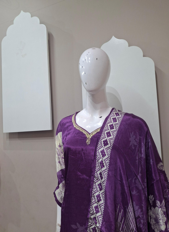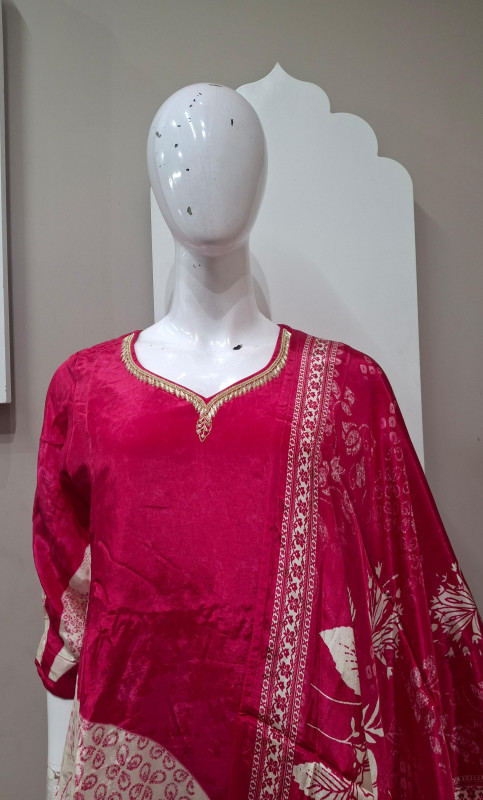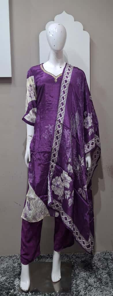 Natural Crepe Kurta Set with digital prints and delicate handwork, paired with a flowy dupatta and comfortable santoon pant. Available in Rust, Rani, Purple & Peacock Blue.