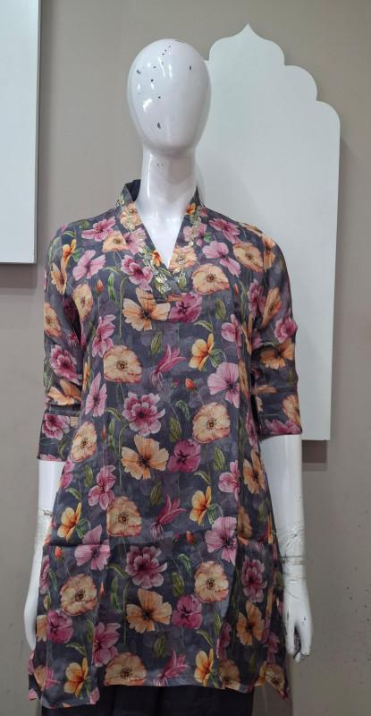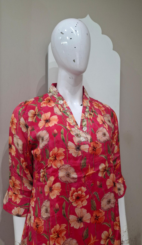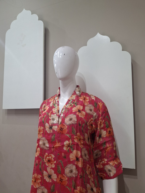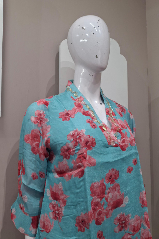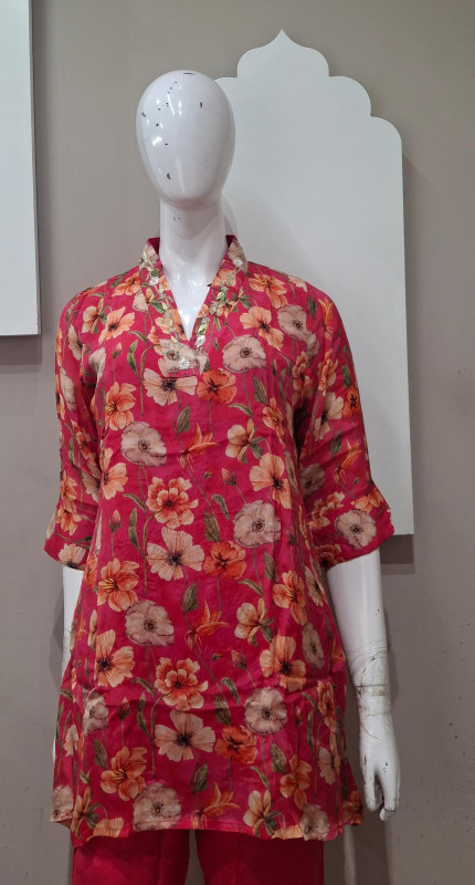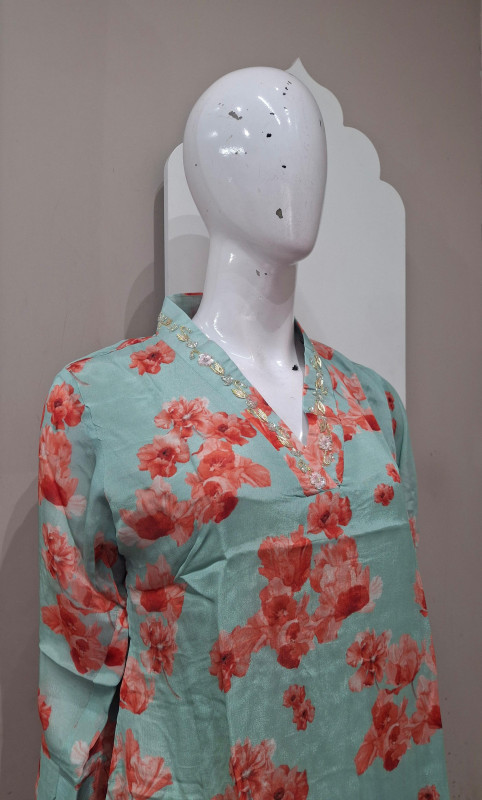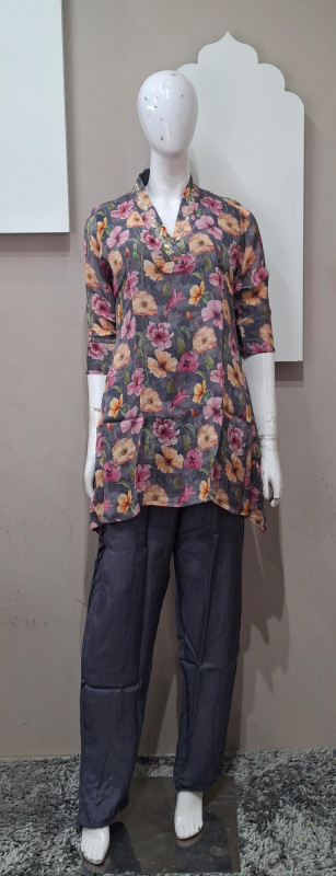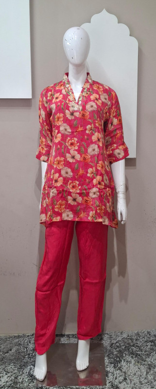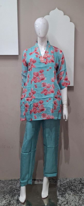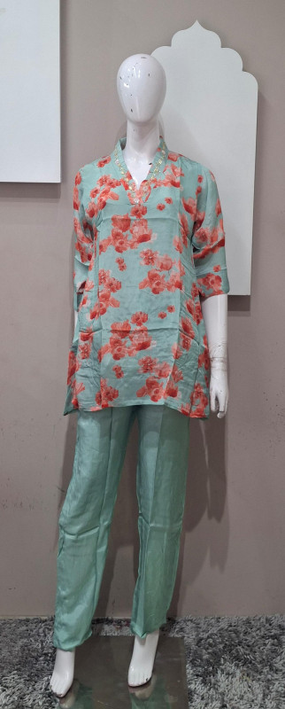 Chinon fabric co-ord set with soft digital floral print. Light, comfortable, and perfect for everyday wear and casual outings.