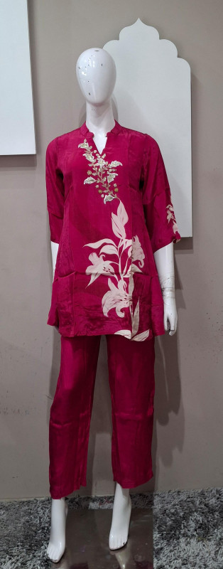 Natural crepe co-ord set with light handwork and digital floral print in blue & rani colors. Easy to wear, comfortable, and perfect for everyday elegance.
