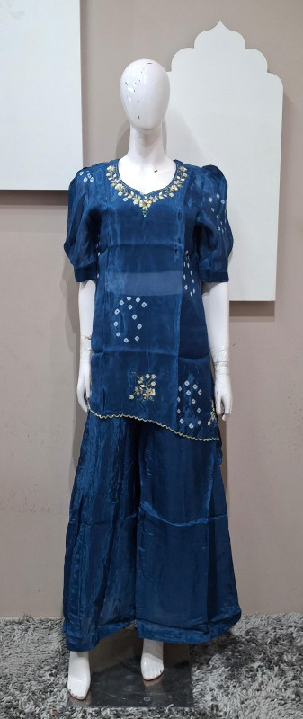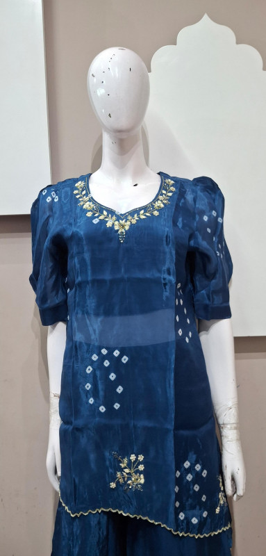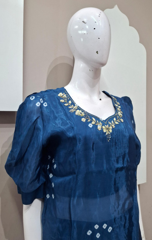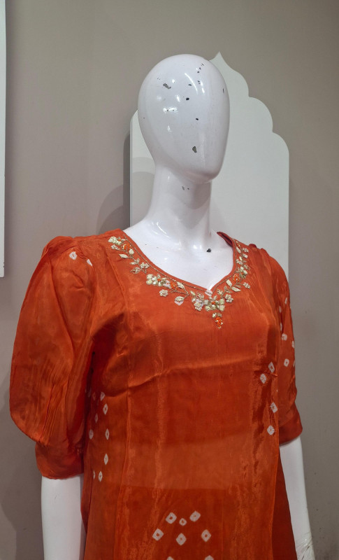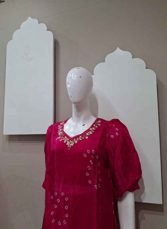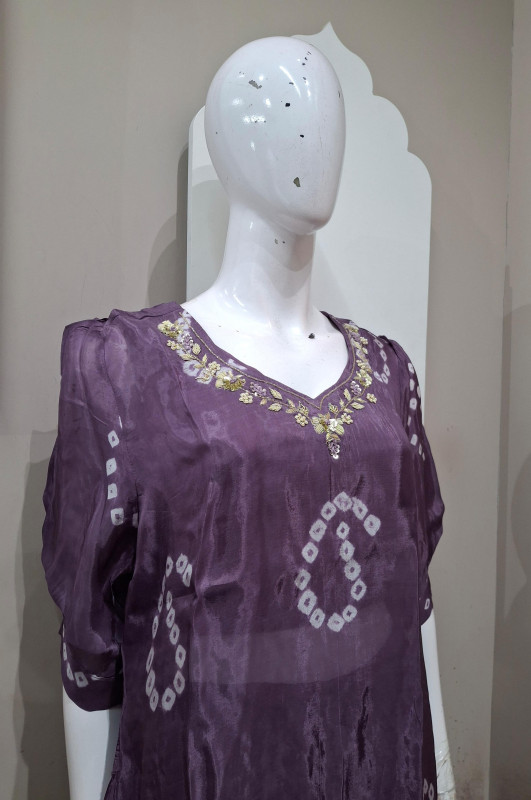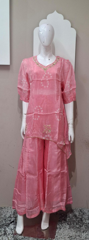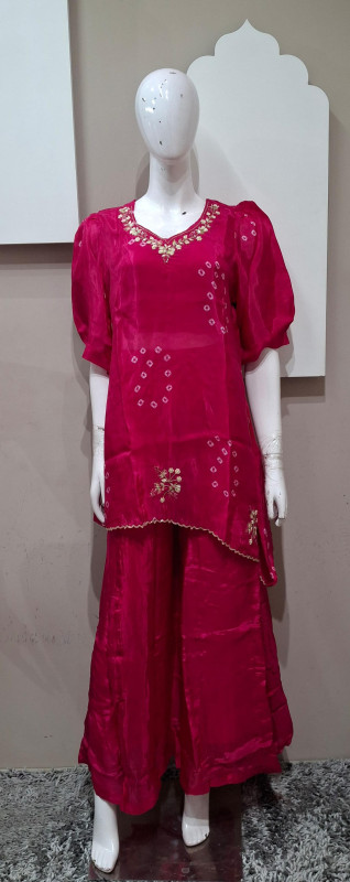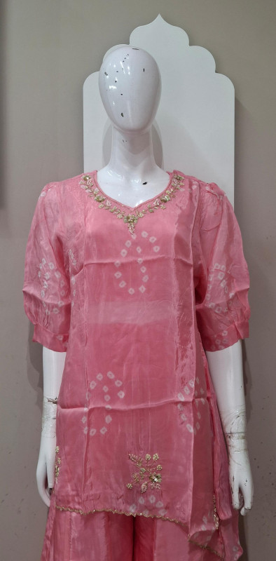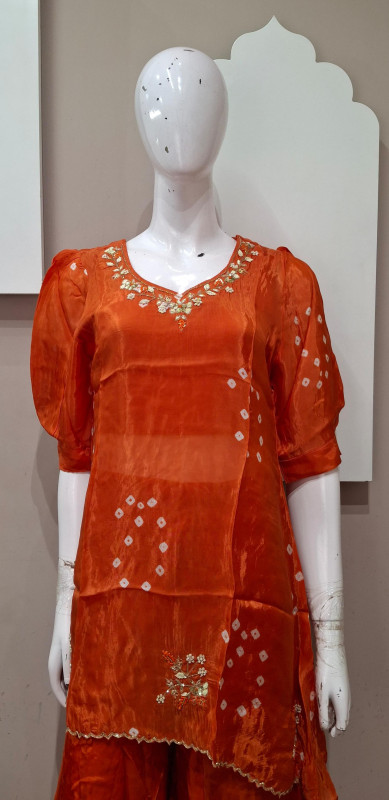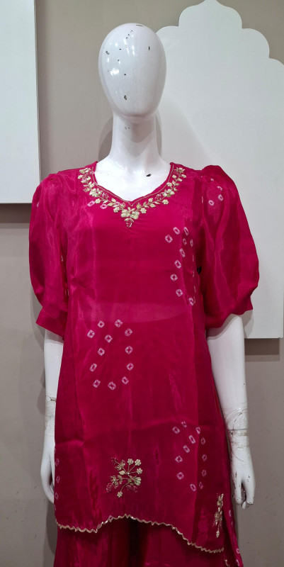 H.O. silk transparent kurta in Bandhani style with traditional handwork, paired with a matching plazo for an elegant look.