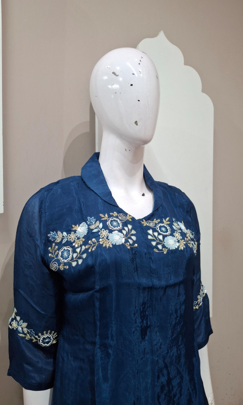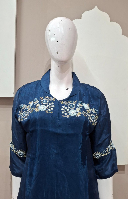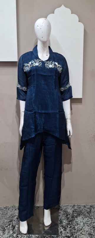 H.o silk co-ord set with light handwork, paired with matching pants for a party  and comfortable look.