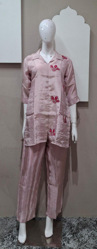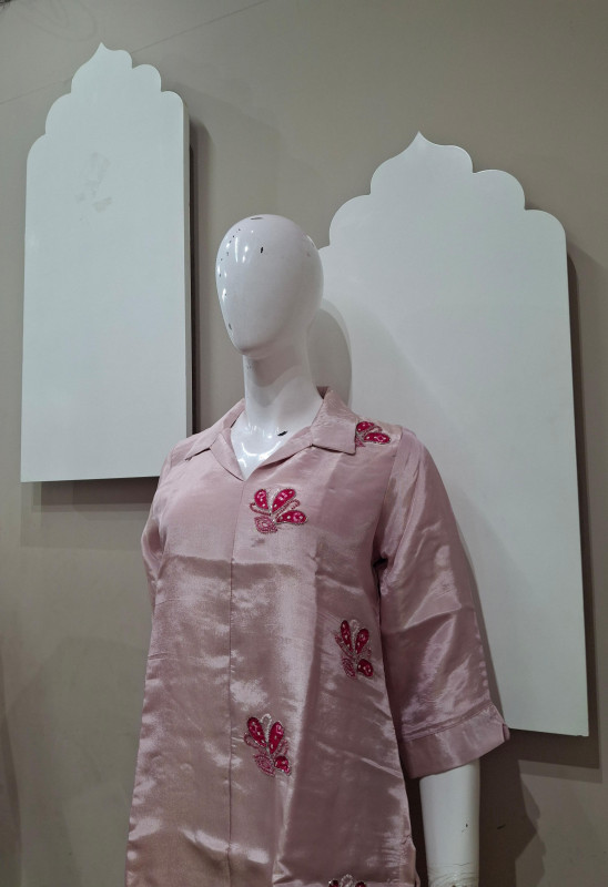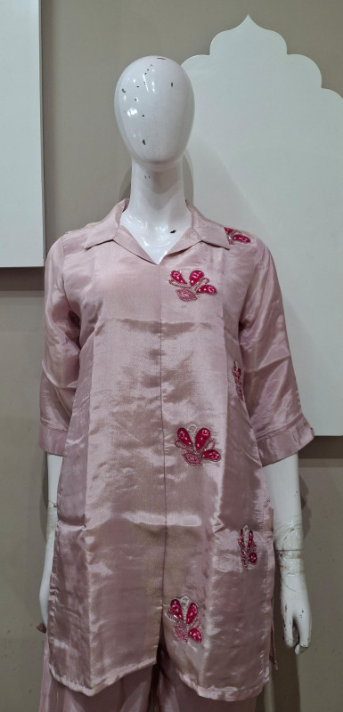 Tissue fabric co-ord set with neat patchwork detailing. Light, comfortable, and perfect for everyday wear and small gatherings.