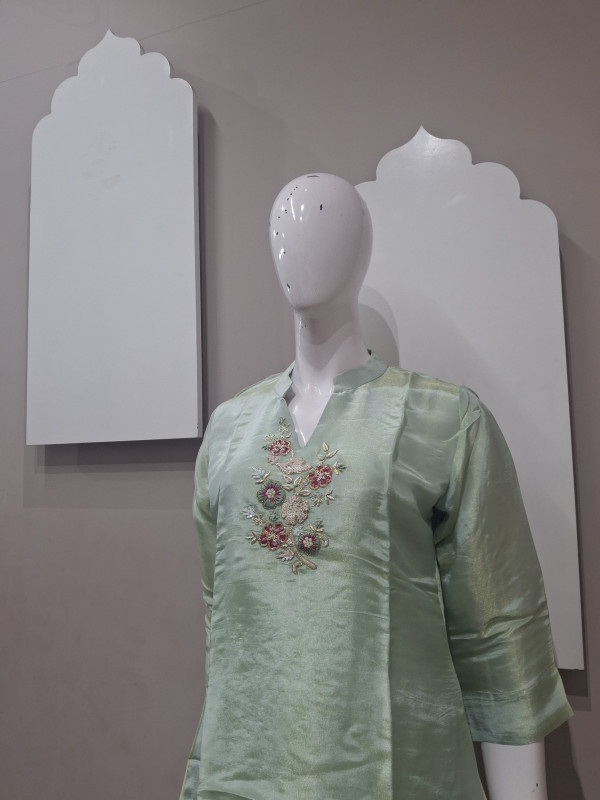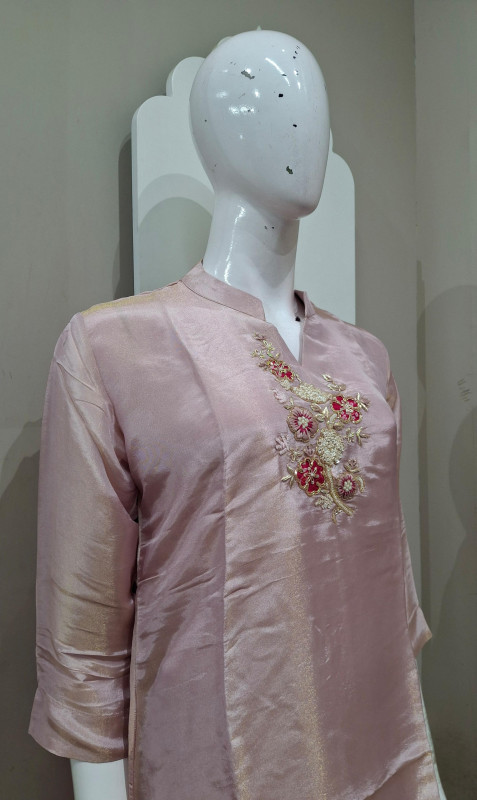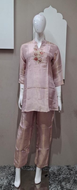 Tissue fabric co-ord set with neat handwork detailing. Light, comfortable, and perfect for everyday wear and small gatherings.