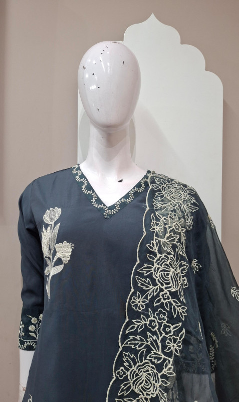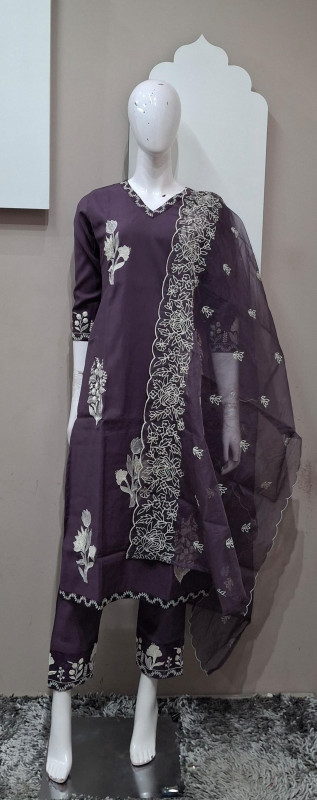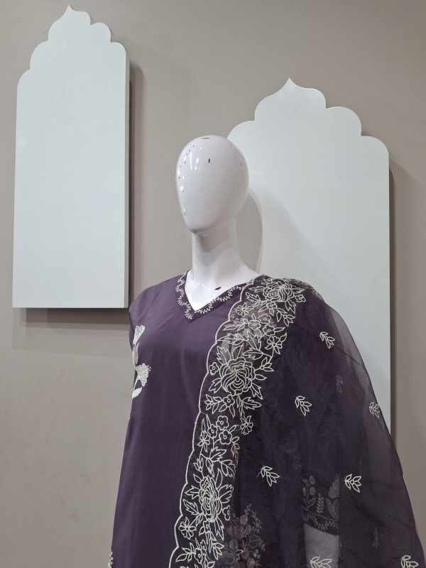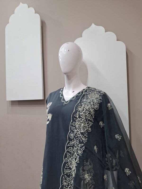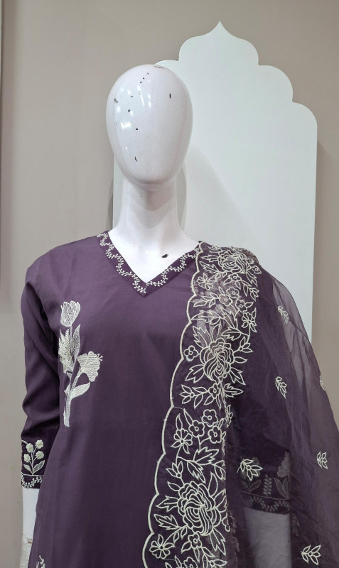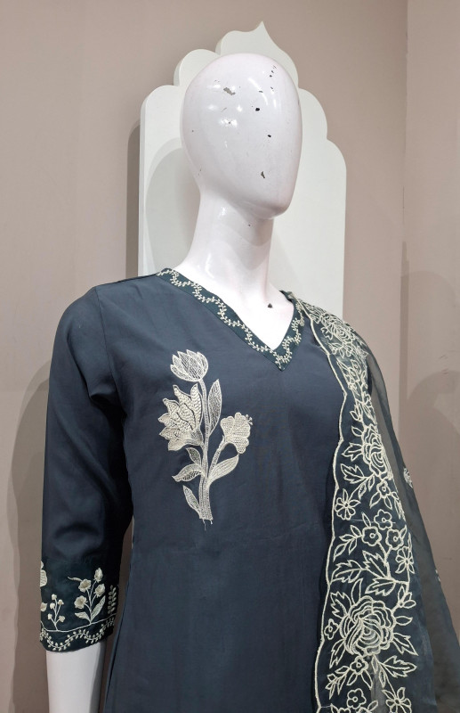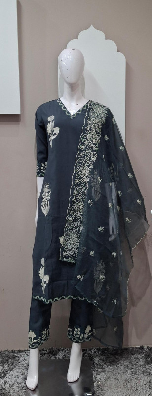 Roman silk fabric kurta, pant, and dupatta set with matching embroidery work. Comfortable, elegant, and perfect for daily and light festive wear.