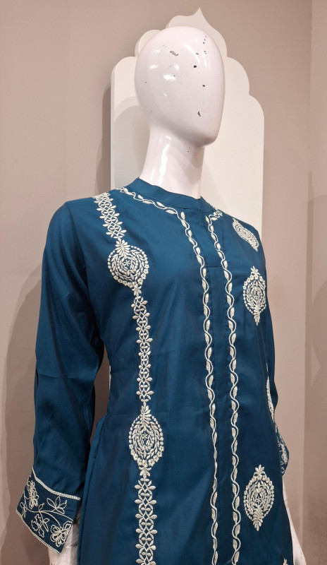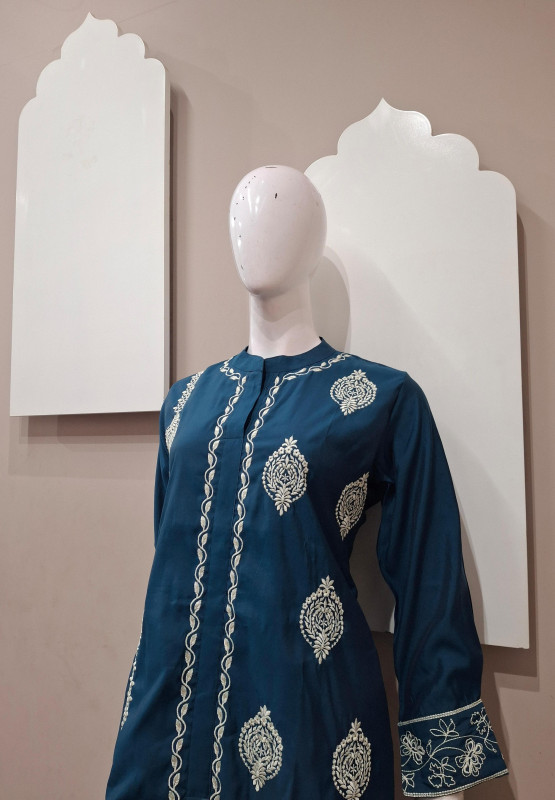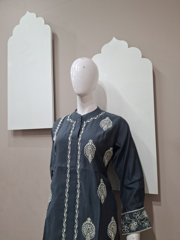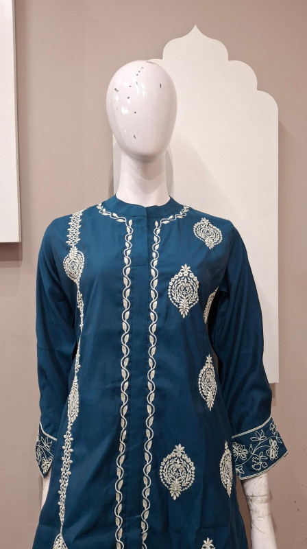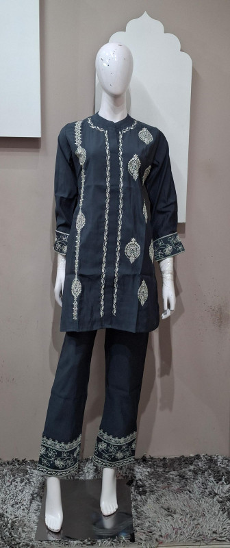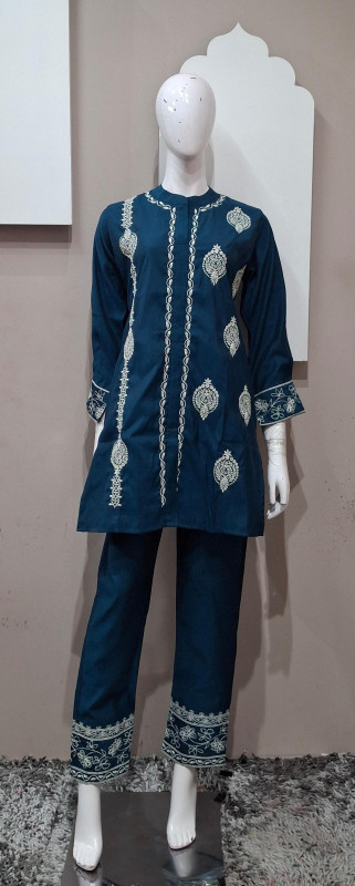 Roman silk co-ord set with  embroidery work, paired with matching pants. Comfortable, classy, and perfect for everyday and light festive wear.